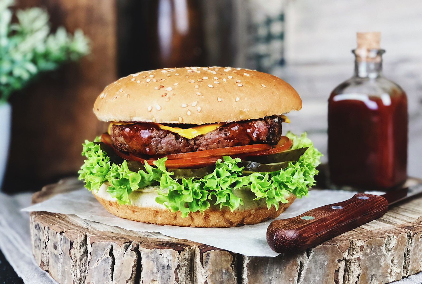 Бургер на огне ,Жареная котлета с маринованным лучком в булочке с соусом и овощами